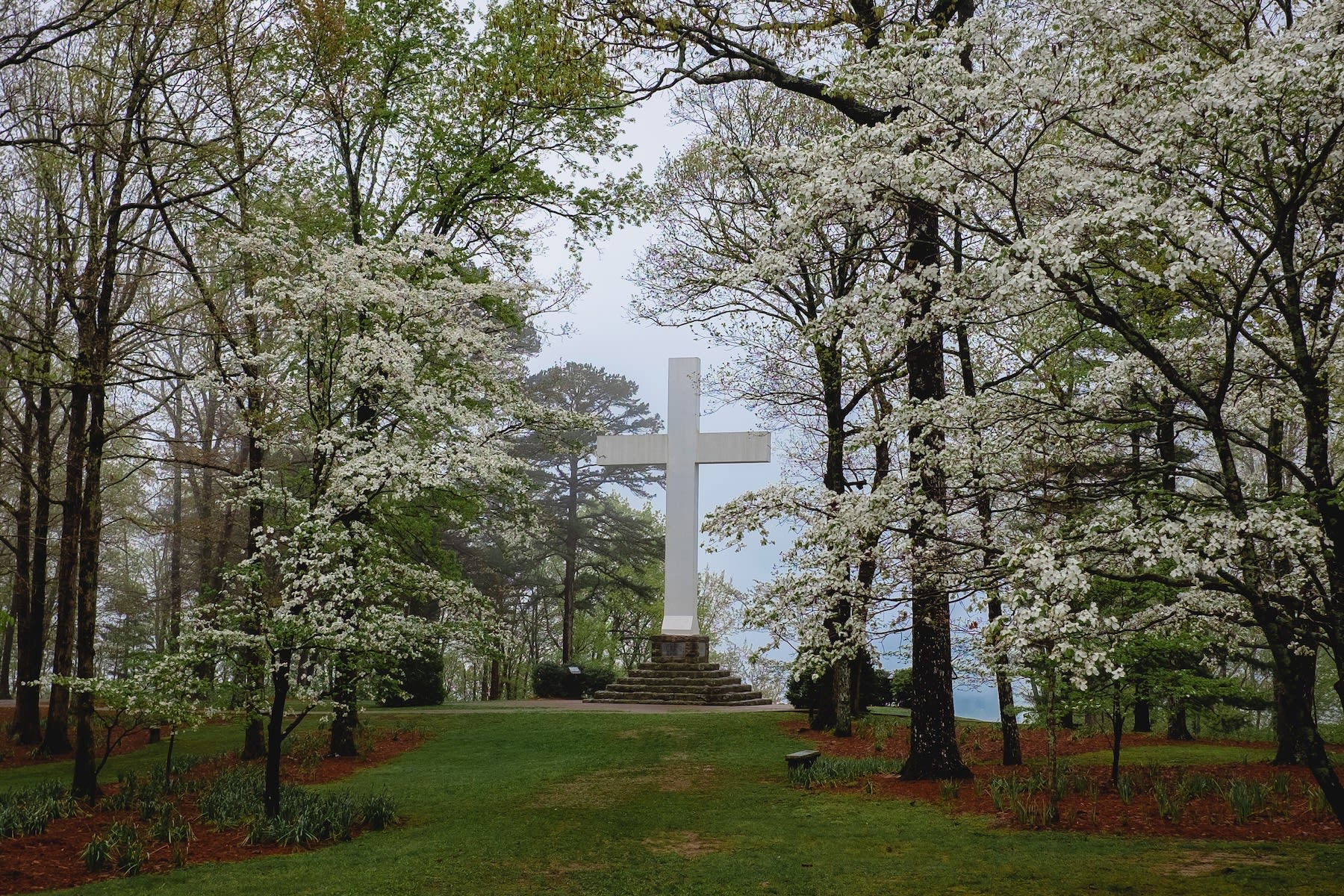 “On Armistice Day 1922 the entire Sewanee community met at University View to build the base of the cross to commemorate those in the community who had died during the First World War. The students of Sewanee Military Academy marched to the site from chapel to provide ceremony for the occasion. Everyone stopped work at eleven o’clock in the morning for three minutes of silence before resuming work. Mountaineers and students hauled rock, cleared land, and laid the stone steps. Women in the community provided a feast for everyone. Even children did what they could to help. The large concrete cross, designed by the engineering class, was erected over the next few months.”